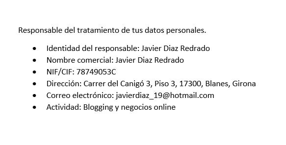 El Usuario declara haber sido informado de las condiciones sobre protección de datos de carácter personal, aceptando y consintiendo el tratamiento de los mismos por parte de Javier Diaz Redrado en la forma y para las finalidades indicadas en el aviso legal.